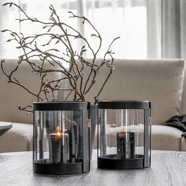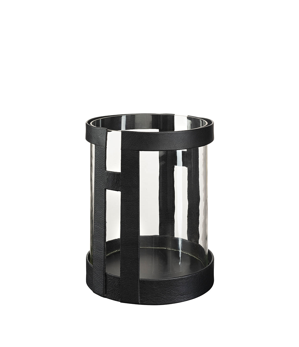 Svart lykta i pulverlackerad metall med läderdetaljer. Handblåst glas.