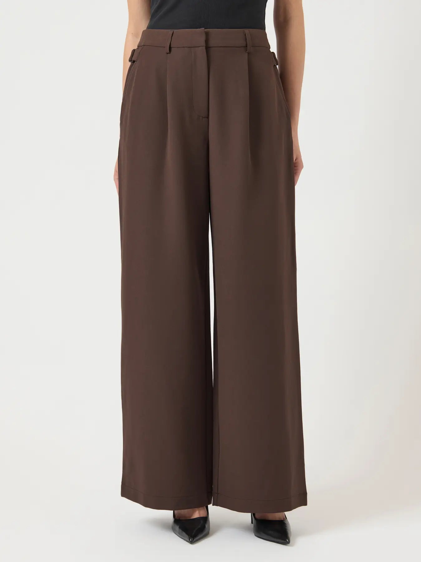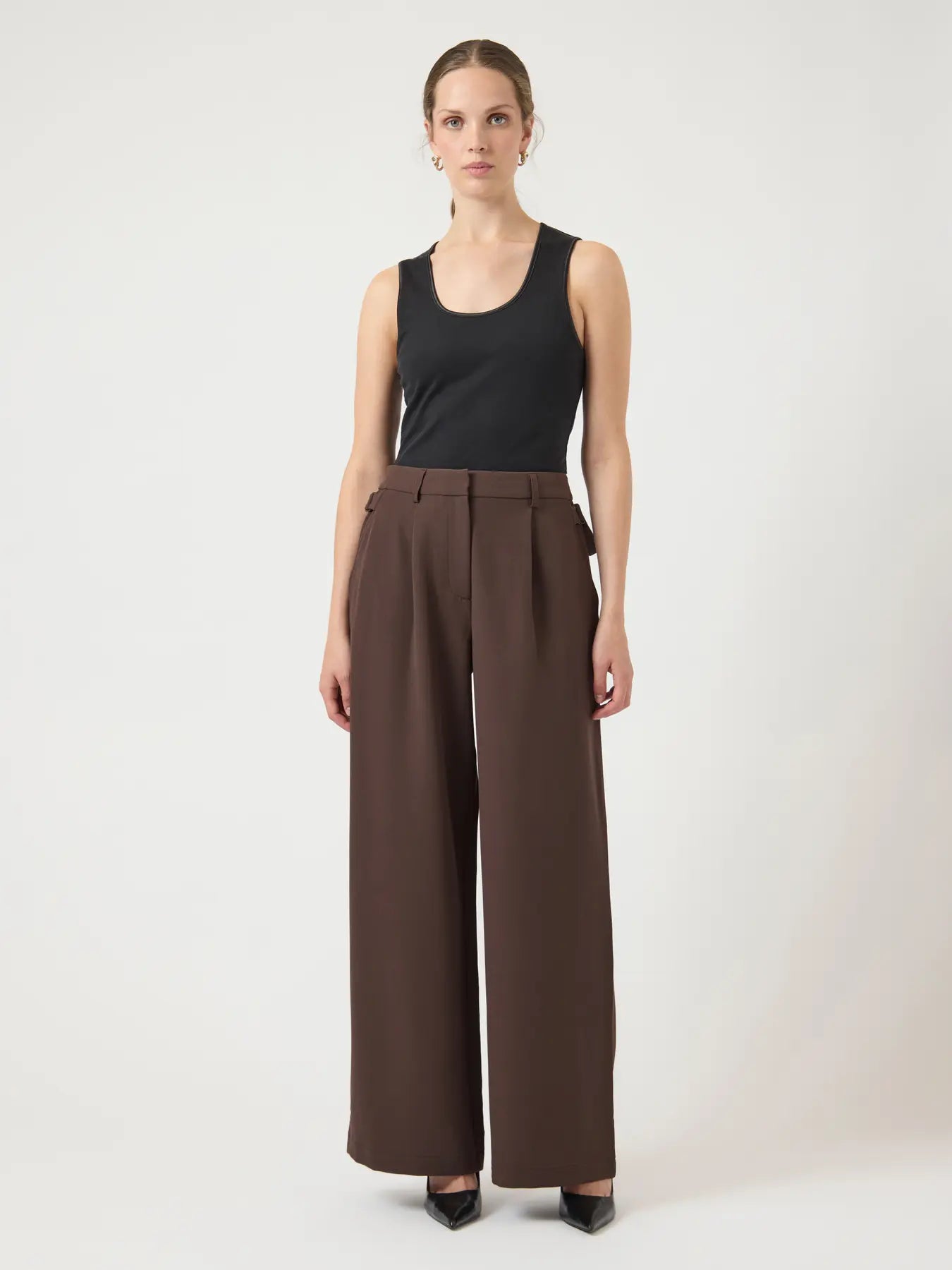 Byxorna är tillverkade i ett stretchigt och följsamt material som ger en smickrande passform och gör dem bekväma att bära hela dagen. Den rika brunfärgen gör dem enkla att matcha med både basplagg och mer uppklädda plagg i din garderob.