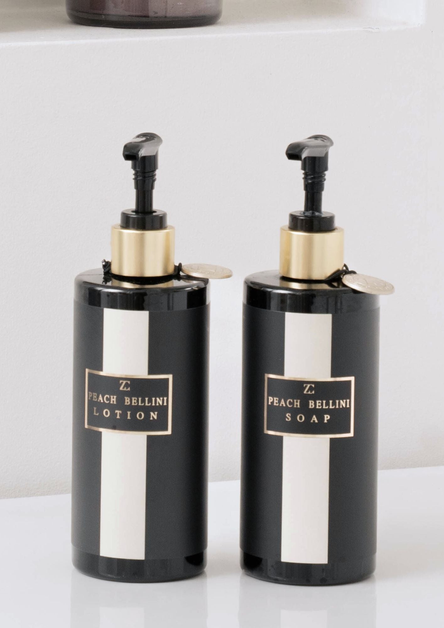 Lotion Peach Bellini härlig doft av krispig fräsch persika. Fin förpackning av återvunnen plast med detalj i guld.