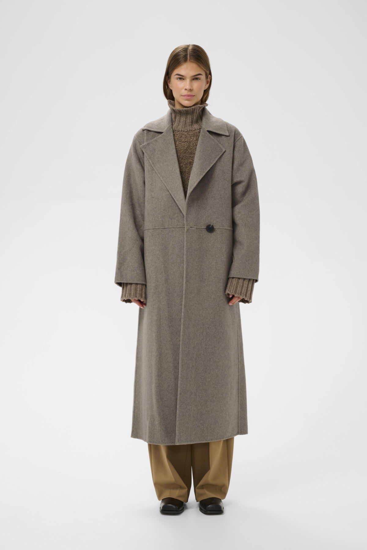 Denna långa damkappa har avslappnad passform, klassiska slag och bälte i midjan. Perfekt ytterplagg för alla tillfällen och komfort hela dagen